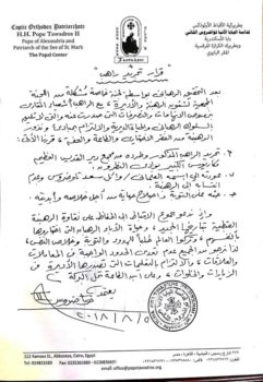 هذا وقد نص القرار على تجريد الراهب وطرده من مجمع ديره وعودته الى اسمه العلماني وهو وائل سعد تاوضروس،