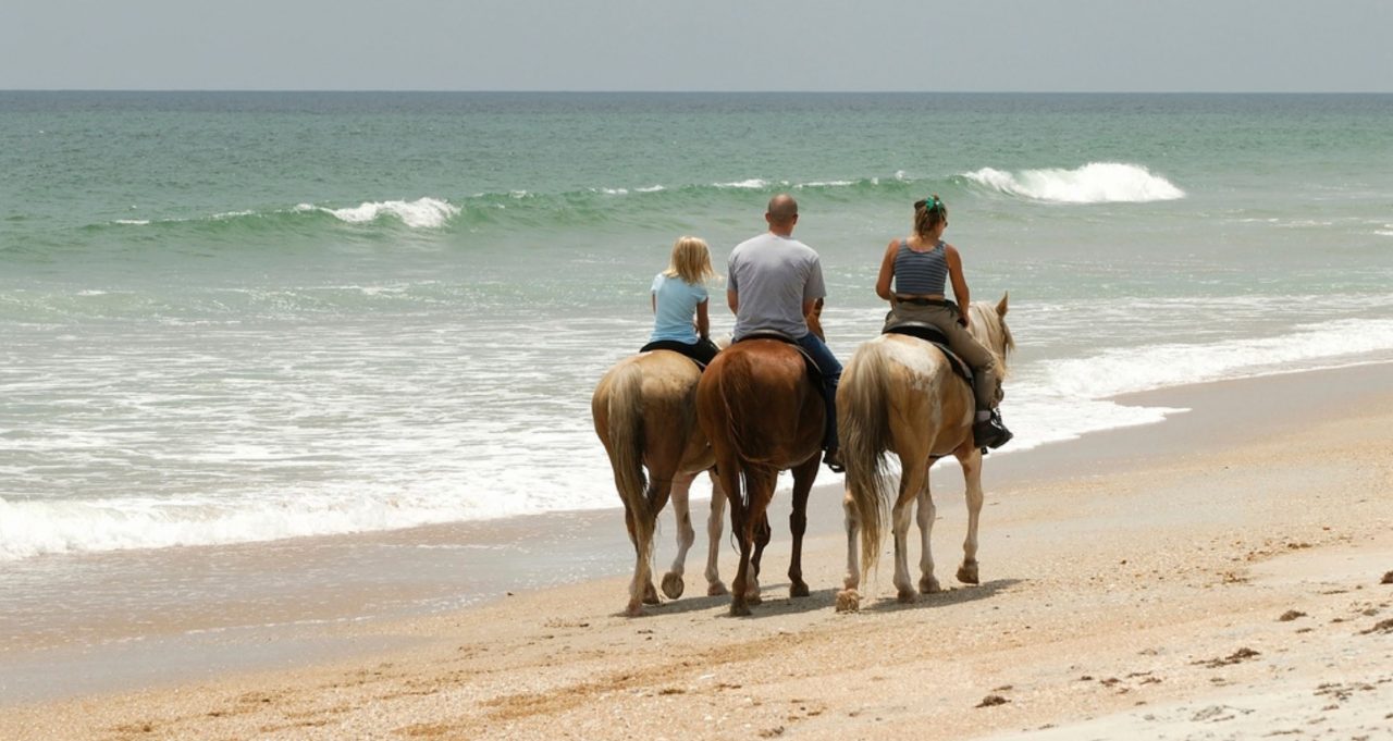 Fit horses are trained to walk or swim in coastal areas, while carrying human riders.