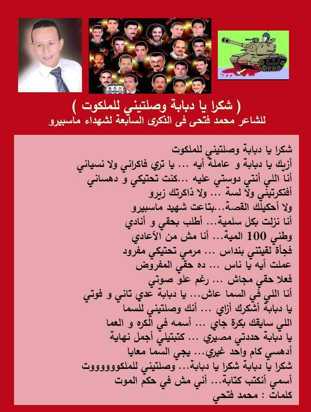 فى الذكرى السابعة لشهداء ماسبيرو شكرا يا دبابة وصلتيني للملكوت أزيك يا دبابة و عاملة أيه … يا تري فاكراني ولا نسياني أنا اللي أنتي دوستي عليه …كنت تحتيكي و دهساني أفتكرتيني ولا لسة … ولا ذاكرتك زيرو ولا أحكيلك القصة…بتاعت شهيد ماسبيرو أنا نزلت بكل سلمية… أطلب بحقي و أنادي وطني 100 المية… أنا مش من الأعادي فجأة لقيتني بنداس … مرمي تحتيكي مفرود عملت أيه يا ناس … ده حقي المفروض فعلا حقي مجاش … رغم علو صوتي أنا اللي في السما عاش… يا دبابة عدي تاني و فوتي يا دبابة أشكرك أزاي … أنك وصلتيني للسما اللي سايقك بكرة جاي … أسمه في الكره و العما يا دبابة حددتي مصيري … كتبتيلي أجمل نهاية أدهسي كام واحد غيري… يجي السما معايا شكرا يا دبابة شكرا يا دبابة… وصلتيني للملكووووووت أسمي أنكتب كتابة… أني مش في حكم الموت كلمات : محمد فتحي