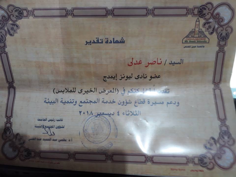 وبمناسبة المعرض الخيرى بجامعة عين شمس الذى اقامته اندية الليونز ” نادى لوينز ايليت برئاسة أ الهام سياج ونادى لوينز امون برئاسة د / بثينة الكاتب – ونادى لوينز ايمدج برئاسة الاعلامية عبير محمود ” و تم ايضا تكريم رؤساء النوادى الثلاثة وعدد من اعضاء هذة الاندية . وفى هذة الاحتفالية قامت الاستاذة سلوى البورينى بتسليم دبوس النادى الى بعض من اعضاء نادى لوينز ايمدج ومنهم المفكر افقتصادى ناصر عدلى محارب عضو النادى .