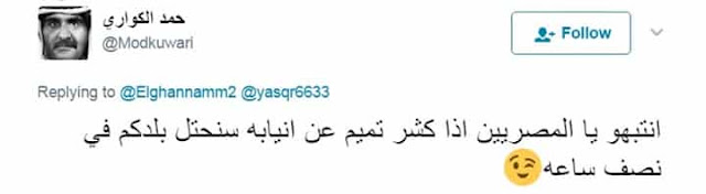 حيث قام حمد الكوارى وزير الثقافه القطرى الاسبق ومرشح قطر لليونسكو بنشر تويته على حسابه الشخصى تويتر على صفحات التواصل الاجتماعى يهدد فيها مصر بكل بجاحه وهدد مصر قائلا : انتبهو يا مصريين اذا كشر تميم عن انيابه سنحتل بلدكم فى نصف ساعه