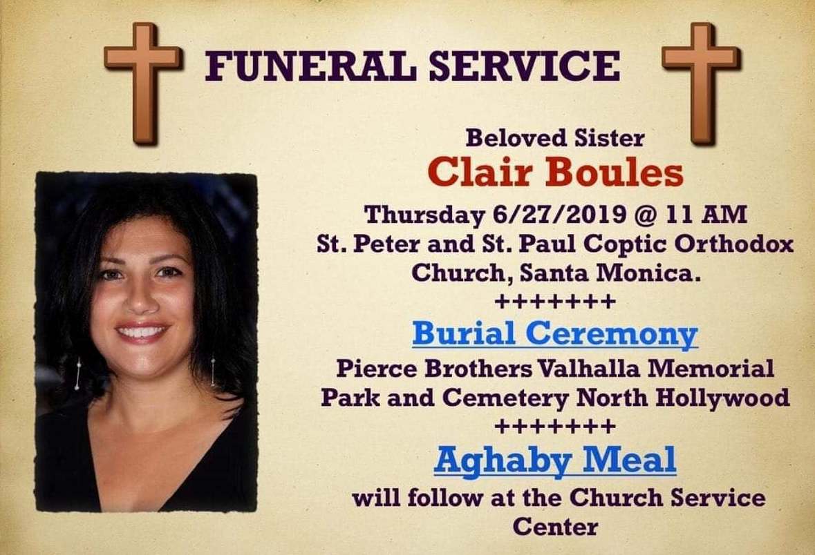 ستقام صلاة الجنازة على روح الابنه الحبيبه والأخت الغالية كلير أسعد زوجة جورج بأمريكا يوم الخميس الموافق ٢٧ يونيو ٢٠١٧ الساعه ١١ صباحا بتوقيت أمريكا (كاليفورنيا ) الساعه ٨ مساء بتوقيت القاهره بكنيسة القديسين بطرس وبولس سانت مونيكا. وستذاع الجنازة على موقع الكنيسه .