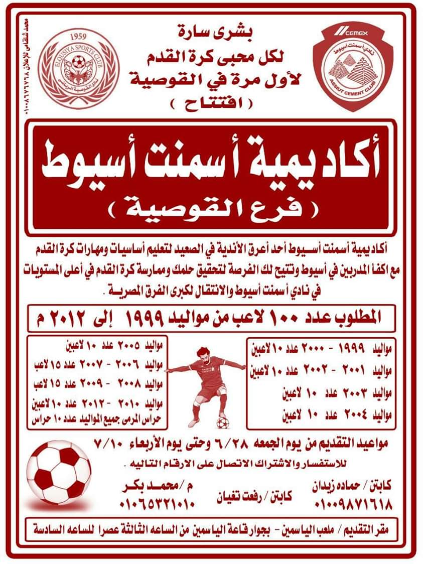 حيث لأول مرة في القوصية افتتاح اكاديميه اسمنت اسيوط أحد أعرق الأندية في الصعيد لتعليم اساسيات ومهارات كرة القدم مع اكفأ المدربين في اسيوط وتتيح لك الفرصة لتحقيق حلمك وممارسة كرة القدم في اعلي المستويات في نادي اسمنت اسيوط والانتقال لكبري الفرق المصرية .