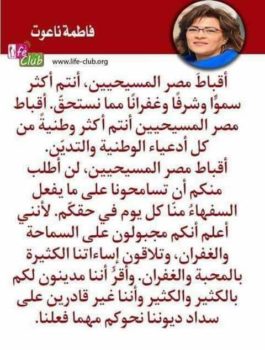 دكتور سيتي شنودة يوجه رسالة الي فاطمة ناعوت ردا علي الهجمة الشرسة الأخيرة ضدها