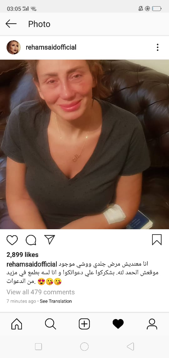 في اول ظهور لها بعد مرضها الأخير نشرت الإعلاميةريهام سعيد صورة لها علي موقع تبادل الصور” انستجرام” وهي في منزلها وكتبت ريهام علي الصورة ” لأصحابي اللى عايزين يطمنوا أنا معنديش مرض جلدي، ووشي موقعش، ومش هيقع، أرجو الدعاء ” .