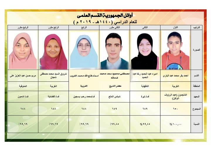وصرح الشيخ صالح أن الأول على مستوى الجمهورية هو أحمد بكر محمد عبد الباري، وهو الوحيد الحالصل على نسبة 100% بمجموع درجات 650 درجة ، ومصطفى محمود سعد من كفر الشيخ بمجموع ٦٤٩ درجة الثاني مكرر على شعبة العلمي ، كما أن الثانية على الجمهورية هي أميرة عبد الحميد من الدقهلية بمجموع ٦٤٩.