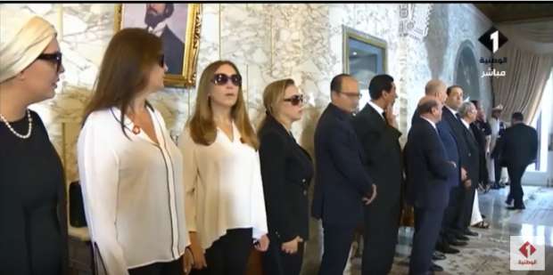 جذبت الأنظار في حفل التأبين الذي أعقب الجنازة العسكرية، قبل نقل الجثمان إلى مدافن العائلة وانضمام الجماهير، ارتداء زوجة السبسي شاذلية سعيدة فرحات، ونجلته الكبرى آمال قائد السبسي، اللون الأبيض بمراسم عزائه، اليوم.