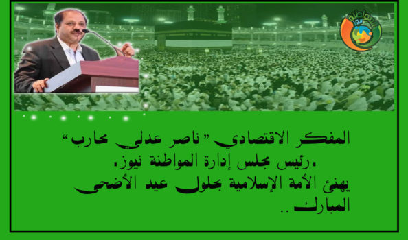 يتقدم المفكر الاقتصادي ” ناصر عدلي محارب ” ـ رئيس مجلس إدارة المواطنة نيوز ـ بخالص التهاني للشعب المصري ، و الأمة الإسلامية لحلول عيد الأضحى المبارك ، أعاده الله علينا بالخير و اليمن و البركات ..