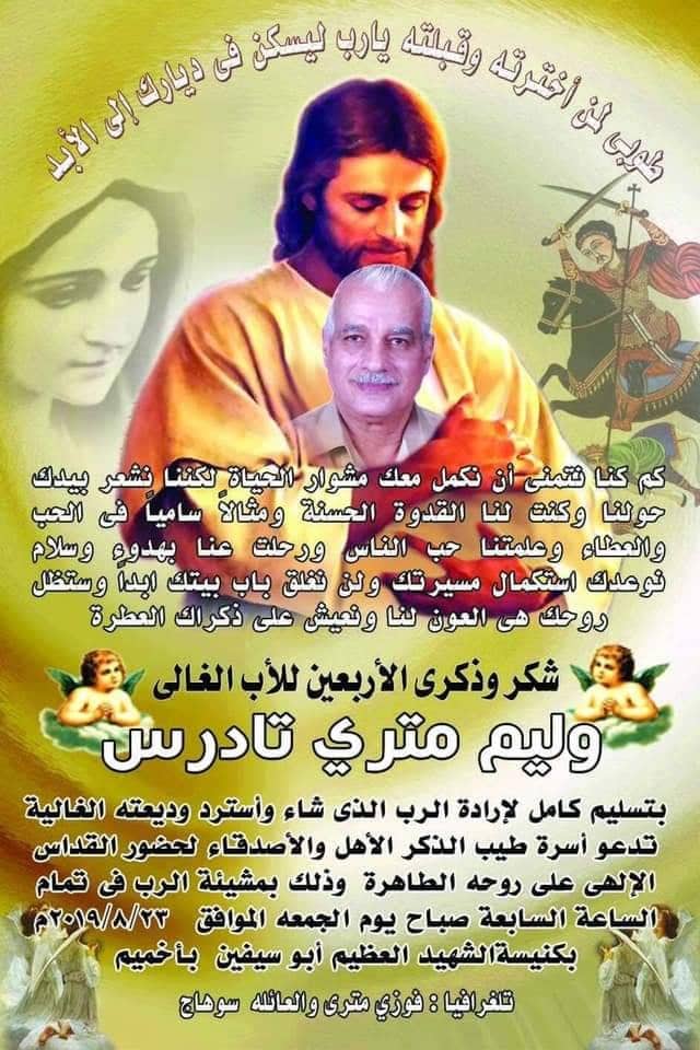 بتسليم كامل لإرادة الرب الذى شاء واسترد وديعته الغالية تدعو أسرة طيب الذكر المتنيح وليم مترى تادروس الأهل والأحباب والأصدقاء لحضور القداس الإلهى على روحه الطاهرة وذلك بمشيئة الرب فى تمام الساعة السابعة صباح يوم الجمعة الموافق 23-8-2019 بكنيسة الشهيد العظيم أبو سيفين بمركز أخميم بمحافظة سوهاج