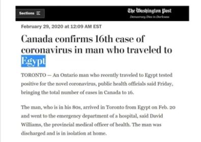 تداولت بعض مواقع الأخبار العربية خبر إصابة كندى عائد من مصر بفيروس كورونا ، ونشرت تلك المواقع نص تصريحات بإسم وزارة الصحة الكندية بإحدى الصحف الأجنبية ” واشنطن بوست ” ,