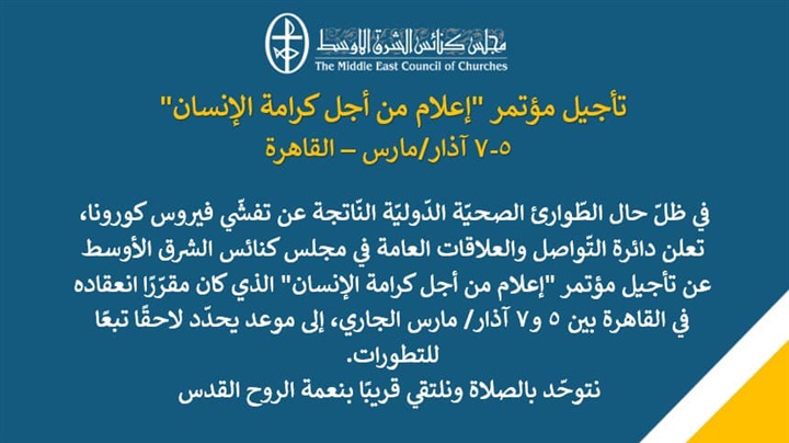 يذكر أنه كان من المقرر ان تفتتح دائرة التواصل والعلاقات العامّة في مجلس كنائس الشّرق الأوسط، تحت رعاية البابا تواضروس الثّاني بابا الإسكندريّة وبطريرك الكرازة المرقسيّة، مؤتمر “إعلام من أجل كرامة الإنسان” وذلك في الخامس من مارس، عند السّادسة مساءً، في مركز المؤتمرات في مطرانيّة شبرا الخيمة.