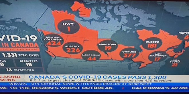 بثت قناة سي تي في نتورك الكندية تقريرا مرعبا عن إنتشار مرض كورونا في كندا، حيث قالت أن حالات الوفاة وصلت الليلة لعشرين حالة وفاة بينما أرتفع عدد المصابين ل١٣٣١في كل كندا.