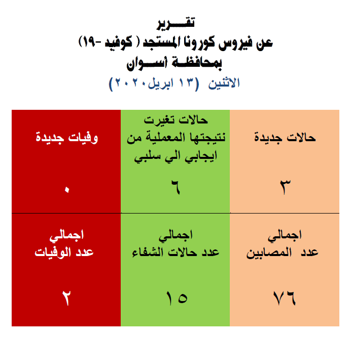 وذكر بيان محافظة أسوان، أن عدد الحالات التى تغيرت نتائجها المعملية من إيجابى إلى سلبى بلغ 6 حالات فى يوم واحد، وإجمالى عدد حالات الشفاء 15 حالة، بينما لم تسجل الصحة بأسوان حالات وفيات جديدة، باستثناء حالتى وفاة أحدهما لسيدة مسنة والأخرى لخفير بكوم أمبو قبل ذلك.