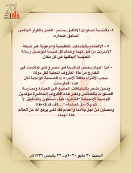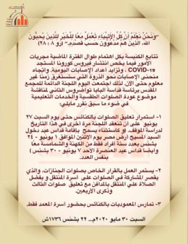 وقررت اللجنة خلال اجتماعها ، استمرار تعليق الصلوات وكافة الأنشطة التي تتطلب تجمعات بالكنائس، وكذلك تعليق صلوات الثالث وذكرى الأربعين للمنتقلين، واستمرار إقامة صلوات الجنازات والأكاليل بأعدادٍ محدودة.
