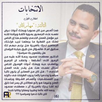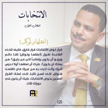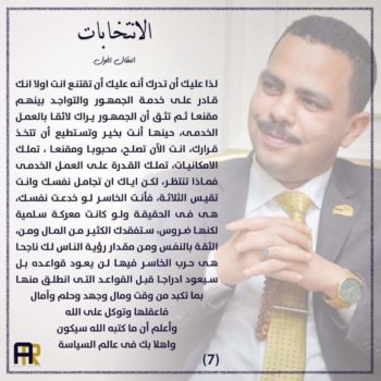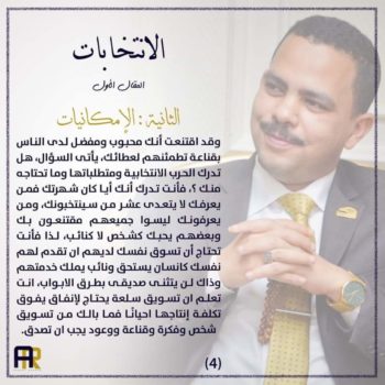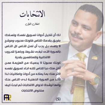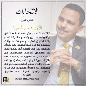 كتب المهندس أشرف رشاد مقال عن الانتخابات وكيفية تسويق نفسك الترشح ، حيث تناول مقاله أربعة عناصر هما : أعقلها وتوكل، حب الناس، الإمكانيات، مهاراتك.