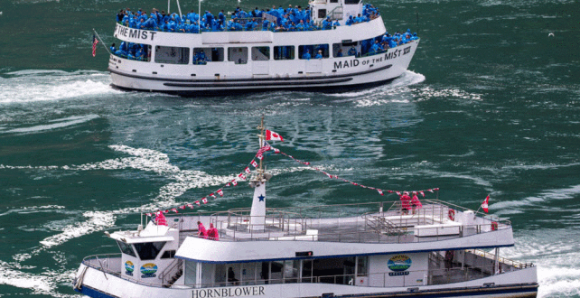 أصبحت القوارب السياحية في شلالات نياجرا نموذج ومثالا للفرق بين كندا وامريكا.