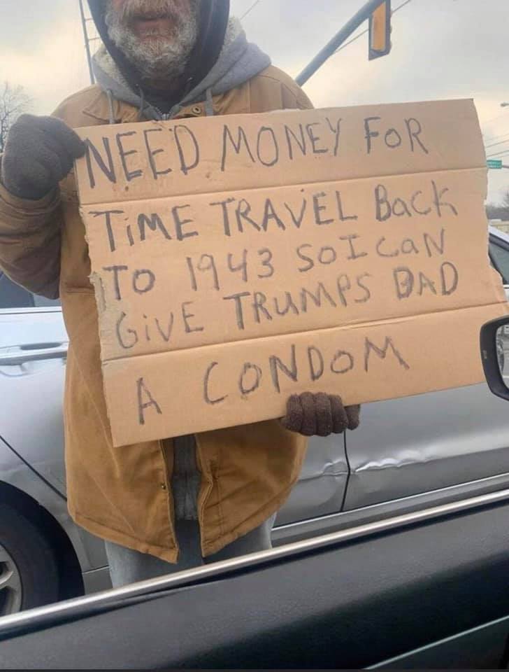 أمريكى يرفع لافتة يطلب فيها من المارة أموال كثيرة لكى يعود بالزمن إلى الوراء لعام 1943 حتى يعطى لأبو ترامب اموالاً لكى يعطيه واقى ذكرى فلا يأتى ترامب للحياة، جميع المارة أعجبوا باللافتة واستطاع هذا الامريكى أن يجمع مبالغ كبيرة