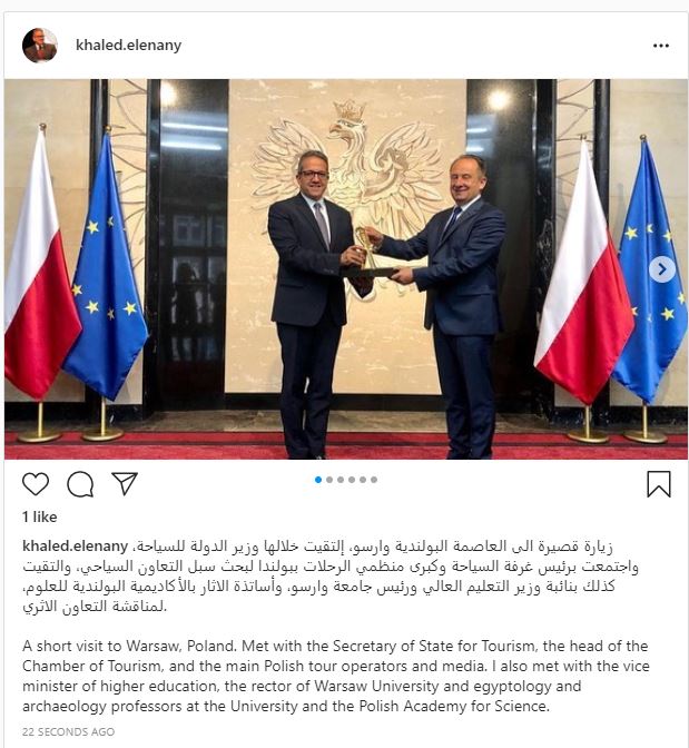 وكتب الدكتور خالد العناني عبر انستجرام، اليوم الخميس :”زيارة قصيرة إلى العاصمة البولندية وارسو، التقيت خلالها وزير الدولة للسياحة، واجتمعت برئيس غرفة السياحة وكبرى منظمي الرحلات ببولندا لبحث سبل التعاون السياحي، والتقيت كذلك بنائبة وزير التعليم العالي ورئيس جامعة وارسو، وأساتذة الاثار بالأكاديمية البولندية للعلوم، لمناقشة التعاون الاثري”.