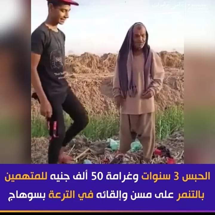 واقعة تنمر بدأت بضحك وهزار ثلاثة شباب على مسن وإلقائه في الترعة وانتهى بهم المطاف خلف الأسوار حيث قضت محكمة جنح سوهاج، في جلستها اليوم الأحد، برئاسة المستشار عمرو فهمى، بالسجن المشدد 3 سنوات، لثلاثة متهمين في واقعة التنمر من مسن بدائرة مركز المراغة، وتغريم كل منهم 50 ألف جنيه.