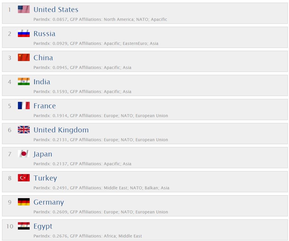 وأشار الموقع إلى أن الترتيب النهائي للقوة النارية العالمية اعتمد على أكثر من 50 عاملا لتحديد درجة ما يسمى بالـ”بور إندكس” لكل دولة، ذاكرا أن “صيغة الترتيب تسمح للدول الأصغر حجما، إن كانت أكثر تقدما من الناحية التكنولوجية، بالتنافس مع الدول الأكبر مساحة والأقل تطورا.. يتم إضافة (على شكل إضافات ـ علاوات وغرامات) للمعدلات للوصول إلى صقل القائمة”.