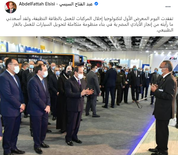 وقال الرئيس، عبر صفحته الرسمية على فيسبوك: “تفقدت اليوم المعرض الأول لتكنولوجيا إحلال المركبات للعمل بالطاقة النظيفة، ولقد أسعدنى ما رأيته من إنجاز الأيادي المصرية فى بناء منظومة متكاملة لتحويل السيارات للعمل بالغاز الطبيعى”.