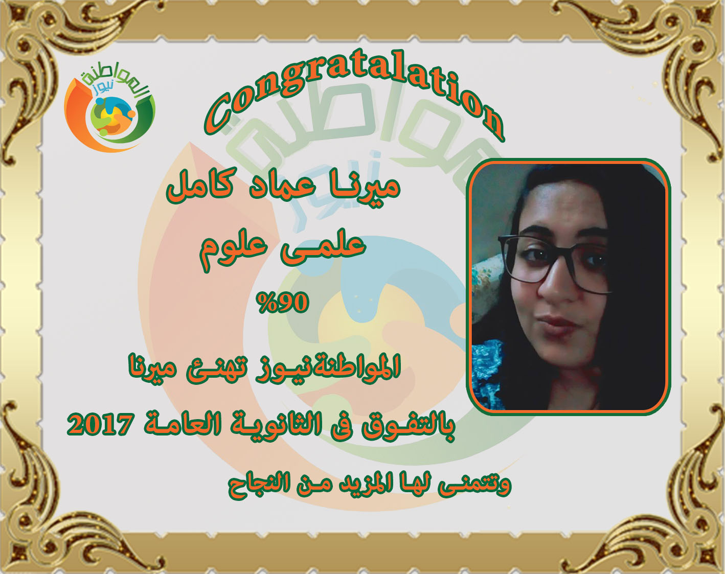 يتقدم المفكر الإقتصادى ناصر عدلى محارب رئيس مجلس ادارة المواطنة نيوز واسرة المواطنة نيوز بخالص التهانى القلبية الصادقة الى ميرنا عماد كامل بمناسبة تفوقها فى الثانوية العامة ، ويتمنوا لها دوام التوفيق والصحة ووافرالسعادة والتفوق  .