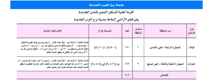 مواقع 912 قطعة أرض إسكان متميز في برج العرب الجديدة