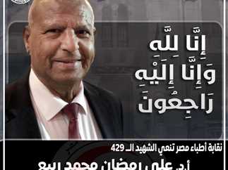 نعت النقابة العامة للأطباء، الشهيد الدكتور على رمضان محمد ربيع أستاذ متفرغ جلدية وتناسلية وعقم بجامعة الأزهر، والذى توفى إثر الإصابة بفيروس كورونا المستجد «كوڤيد 19». وأوضحت النقابة أن الشهيد هو الضحية رقم 429، بين أعضائها المتوفين بفيروس كورونا المستجد منذ بداية الجائحة.