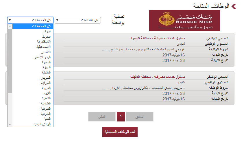 أعلن بنك مصر عن فتح باب التوظيف لديه خلال الفترة من 16 / 7 / 2017 حتى 23 / 7 / 2017 للعمل بفرع البنك بالقاهرة