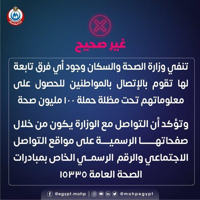 تنفي وزارة الصحة و السكان وجود أي فرق تابعة لها تقوم بالإتصال بالمواطنين للحصول على معلوماتهم تحت مظلة حملة ١٠٠ مليون صحة