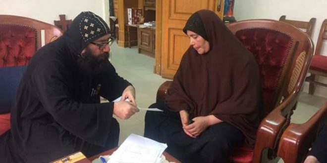 حيث أستقبل نيافة الأنبا يوليوس الأسقف العام لكنائس مصر القديمة وأسقفية الخدمات اليوم وقتها السيدة فتحية محمد زوجة شهيد الوطن رضا عبد الرحمن أسماعيل، أمين الشرطة الذي استشهد أثناء تواجده ضمن حراسة كنيسة الشهيد مارمينا بحلوان أثناء الهجوم الإرهابي الذي تعرضت له الكنيسة تاركًا أسرة مكونة من الزوجة وسبعة أولاد.
