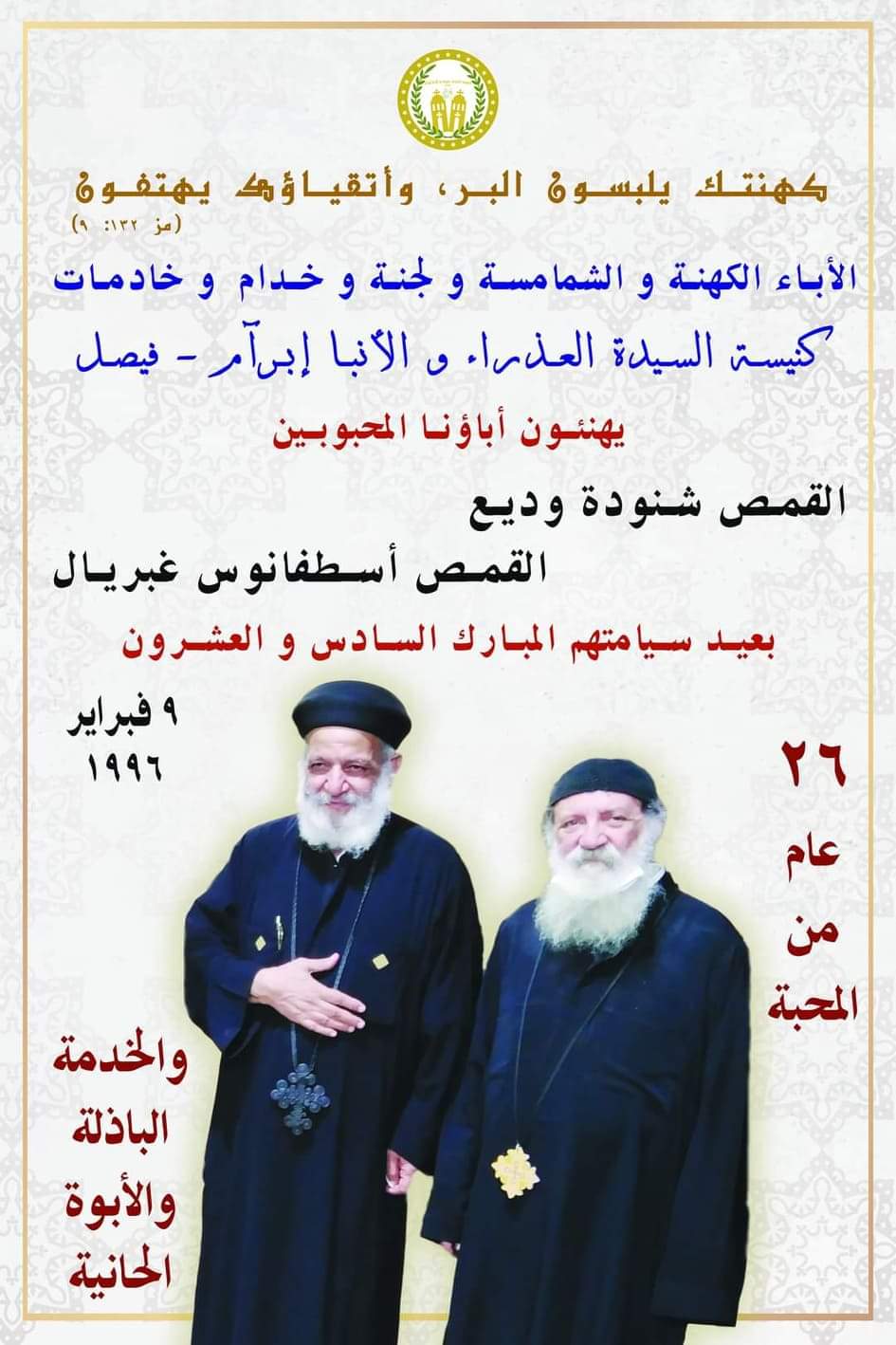 يتقدم المفكر الاقتصادي ورئيس مجلس إدارة موقع المواطنة نيوز ناصر عدلي محارب بالتهنئة للقمص شنودة وديع والقمص اسطفانوس غبريال بمناسبة عيد سيامتهم المبارك السادس والعشرون.