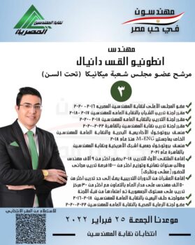 يعد المهندس أنطونيو  القس دانيال من المرشحين  تحت السن ، ومن الوجوه الشابة التى تخوض المعترك الانتخابى الأقوى داخل نقابة المهندسين منذ  سنوات طويلة  والتى ستبدأ يوم الجمعة القادم الموافق  25 نوفمبر