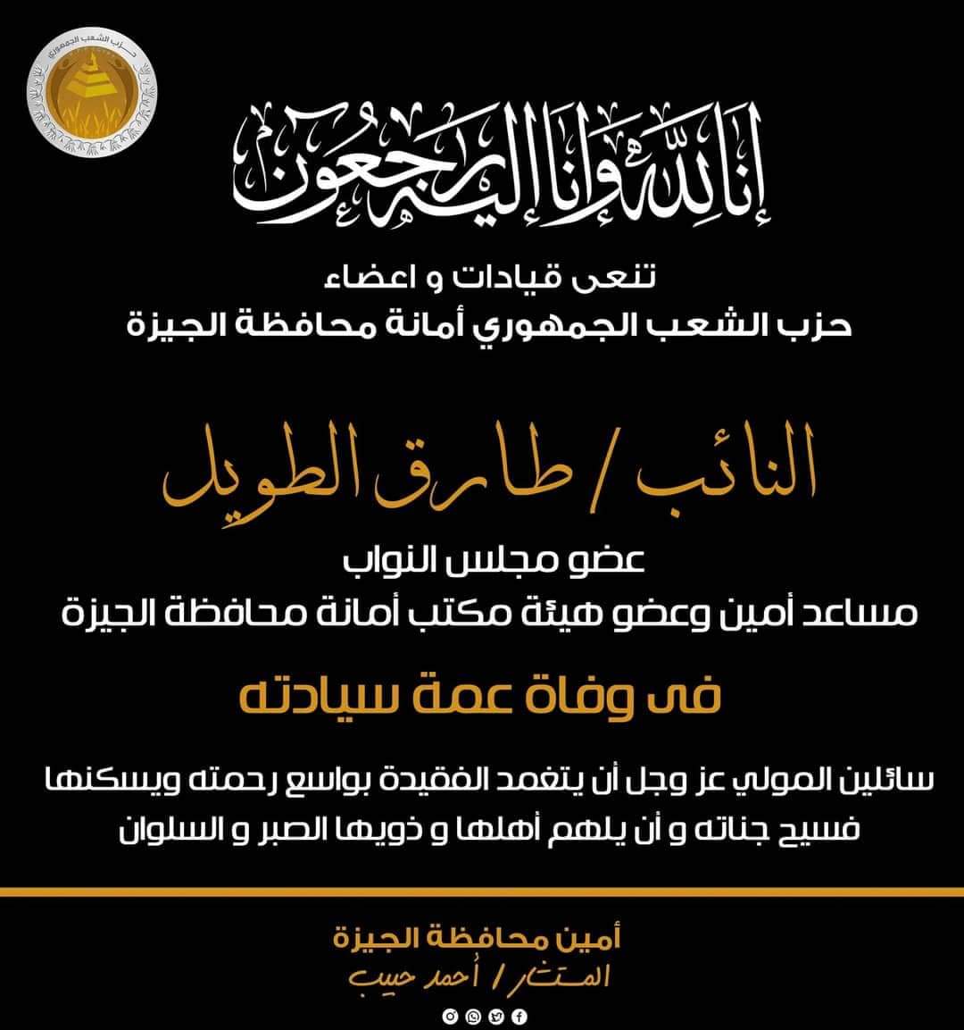 يتقدم المفكر الاقتصادي ورئيس مجلس إدارة موقع المواطنة نيوز  والأمين المساعد لشئون العضويه بأمانة الجيزة لحزب الشعب الجمهوري ناصر عدلي محارب بخالص التعازي للنائب طارق الطويل لوفاة عمته.