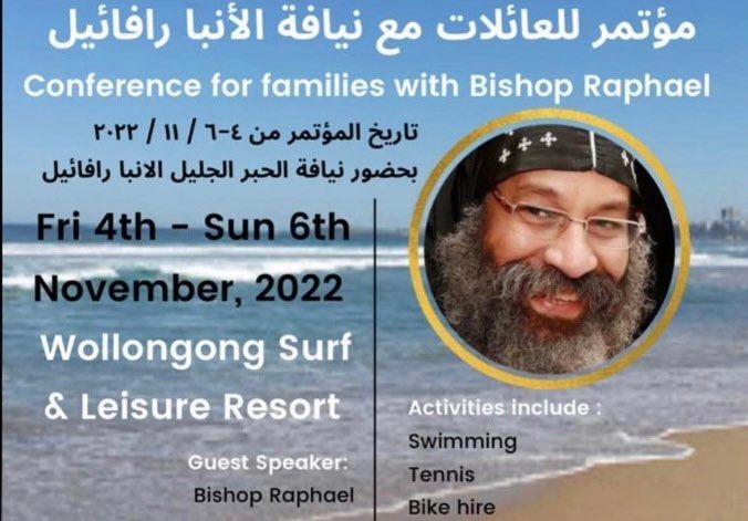 أعلنت إيبارشية سيدنى وتوابعها بأستراليا مساء الخميس الموافق ٢٥ أغسطس ، عن لقاء نيافة الحبر الجليل الأنبا رافائيل ، الأسقف العام لكنائس وسط القاهرة بالأسر الناطقة باللغة العربية ، فى مؤتمر روحى بحضور عدد من كهنة إيبارشية سيدني ، فى الفترة من يوم الجمعة ٤ نوفمبر الى يوم الأحد ٦ نوفمبر المقبل ، وسوف يتضمن المؤتمر عدد من المحاضرات والأنشطة الروحية والرياضية وذلك فى مدينة ولونجونج الساحلية جنوب مدينة سيدنى عاصمة نيو ساوث ويلز .