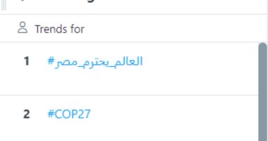 بعشرات الآلاف من التغريدات، تصدر هاشتاجا #العالم_يحترم_مصر و#COP27 قائمة تريند تويتر، تزامنا مع انعقاد قمة المناخ العالمية في مدينة شرم الشيخ المصرية، حيث أشاد العديد من المدونين بالتنظيم، وأيضا الدور الذى تلعبه مصر فى الحد من الانبعاثات والتلوث، وذلك ضمن خطواتها لمواجهة التغير المناخي على كوكب الأرض.