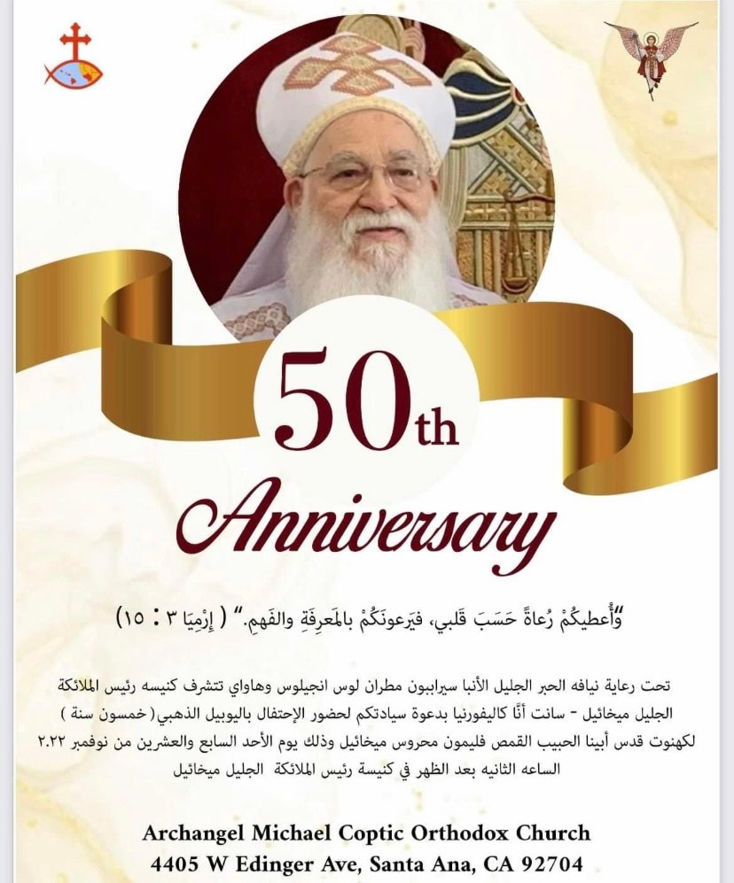 وقد دعت الكنيسة أبنائها الأحتفال باليوبيل الذهبي للقمص فيليمون يوم الأحد المقبل الموافق ٢٧ نوفمبر ، وذلك تحت رعاية نيافة الحبر الجليل الأنبا سرابيون مطران إبيارشية لوس انجلوس وجنوب كاليفورنيا وهاواي .