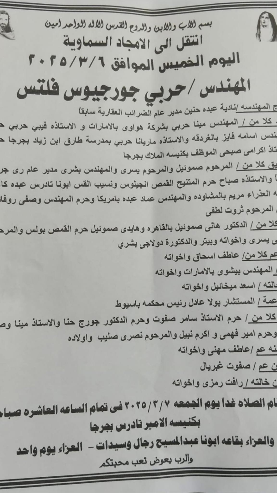 وتقام الصلاة غدا الجمعة الموافق 7\3\2025 بكنيسة الامير تادرس بجرجا الساعة العاشرة صباحا والعزاء بقاعة ابونا عبدالمسيح رجال وسيدات