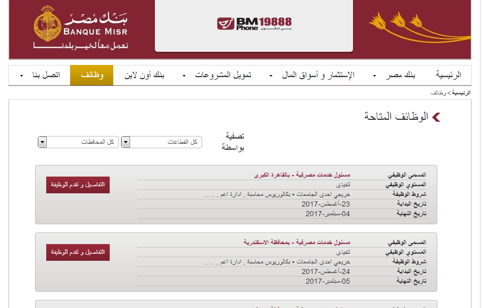 أعلن بنك مصر عبر موقعة الألكترونى عن حاجته لشغل وظيفة مسؤل خدمات مصرفيه فى فروع البنك المختلفة بالمحافظات التالية