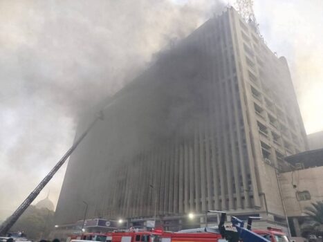 وتواصل قوات الحماية المدنية جهودها للوصول إلى مصدر النيران داخل الأدوار العلوية، وسط صعوبات في التنفس والرؤية بسبب كثافة الأدخنة.
