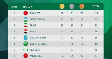 وحصدت البعثة المصرية 36 ميدالية حتى الآن، بواقع 12 ميدالية ذهبية، و10 فضية، و12 برونزية، وتحتل المركز الرابع في جدول الترتيب العام. وتقام دورة ألعاب التضامن الإسلامي المقامة بالعاصمة السعودية الرياض خلال الفترة من 7 حتى 21 نوفمبر الجاري.