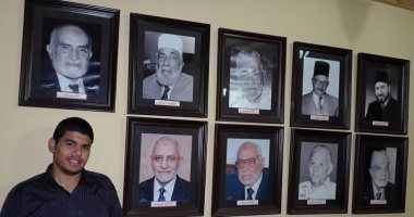 الإخوانى عمر الديب بجوار الصور التذكارية لمرشدى الجماعة