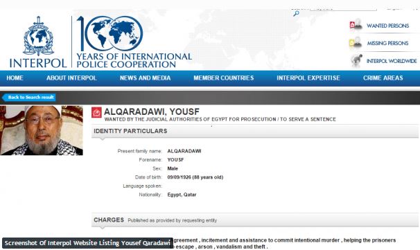 The Ministry of Interior officially announced on Thursday that an internal meeting was held at Interpol headquarters in France where it was decided that the red notice on the Mufti of the Muslim Brotherhood group Youssef al-Qaradawi would not be lifted despite appeals made by him to human rights organizations to remove the red notice.