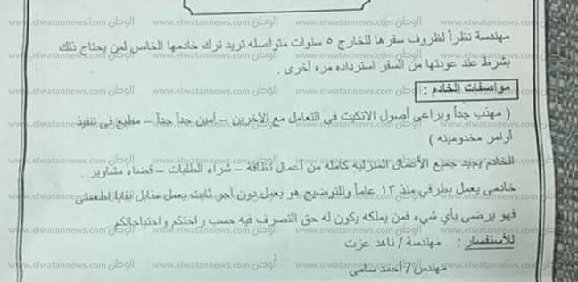 «5 أعوام» هي المدة التي أعلنتها المهندسة وزوجها في الورقة، للتنازل عن الخادم لظروف سفر أسرتها خارج مصر، شرط استعادة الخادم بعد عودتها من الخارج.