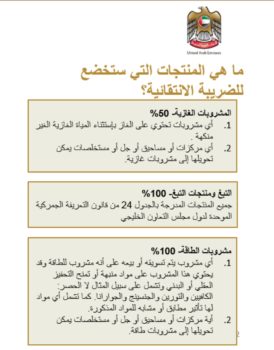 أعلنت الهيئة الاتحادية للضرائب خلال مؤتمر صحفي عقدته في دبي اليوم عن بدء تطبيق الضريبة الانتقائية في دولة الإمارات مع بداية شهر أكتوبر 2017 بنسبة 50% على المشروبات الغازية و100% على كل من منتجات التبغ ومشروبات الطاقة.