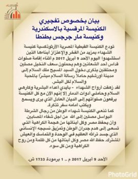 أصدرت الكنيسة القبطية الأرثوذكسية، بيانًا، منذ قليل، بخصوص تفجيري الكنيسة المرقسية بالإسكندرية وكنيسة مارجرجس بطنطا.