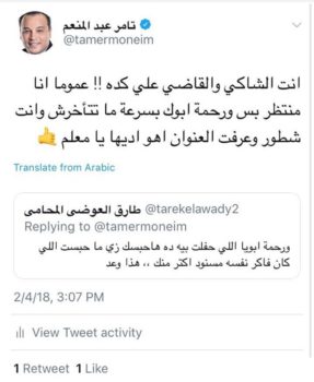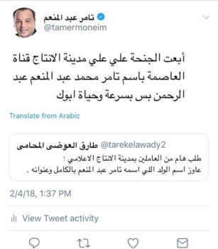 وقام عبدالمنعم، بالرد على تلك التغريدة قائلا: “ابعت الجنحة على قناة العاصمة باسم تامر محمد عبدالمنعم عبدالرحمن”.