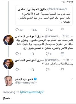بدأت تلك المشادة عندما كتب العوضي على صفحته الشخصية على موقع “تويتر” تغريدة مطالبا فيها العاملين بمدينة الإنتاج الإعلامي اسم الإعلامي تامر عبدالمنعم بالكامل وعنوانه.