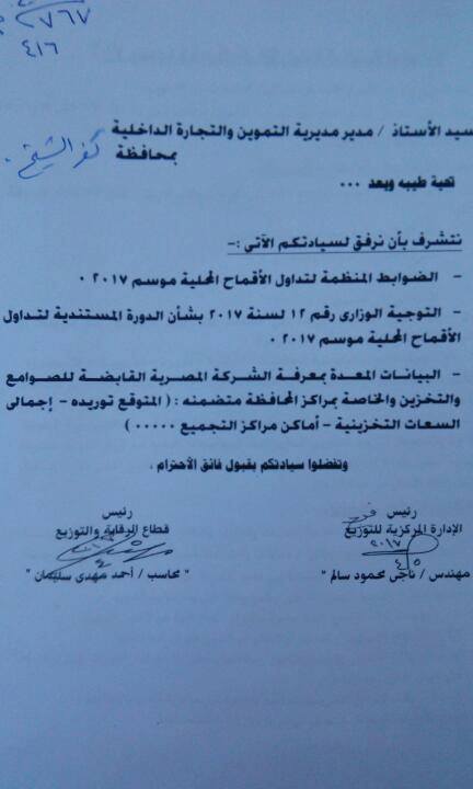 وجاء التوجيه الوزارى رقم 12 لسنة 2017 والخاص بتنظيم عملية الاستلام وأرسلت تلك الضوابط والتوجيه من وزارة التموين،وارسال الضوابط للمديريات لبدء العمل بها