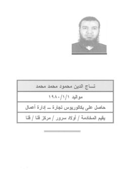 – تاج الدين محمود محمد محمد، مواليد 1980 يقيم بقنا.